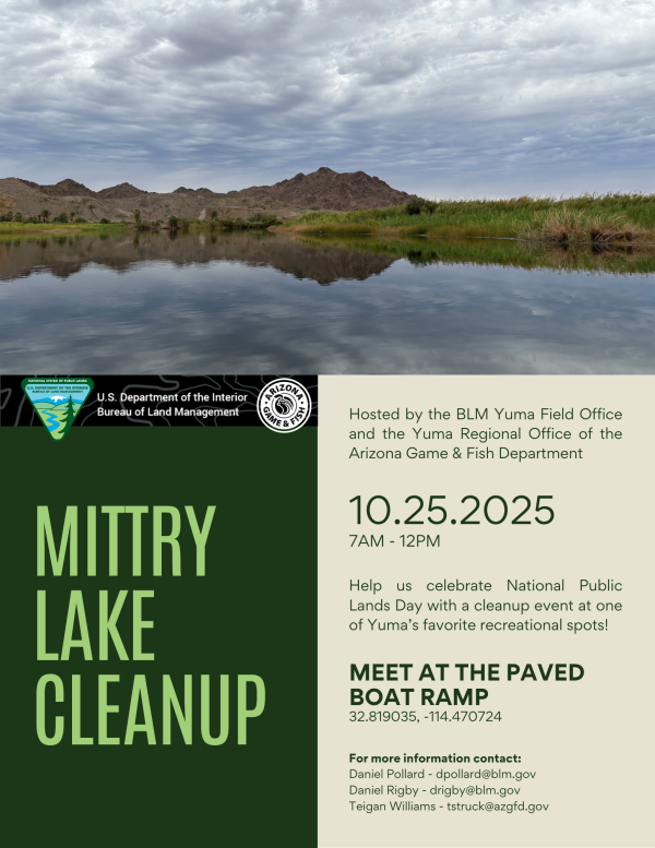 Help us celebrate National Public Lands Day with a cleanup event at one of Yuma's favorite recreational spots! Meet at the paved boat ramp (32.819035, -114.470724). Hosted by the Yuma Regional Office of the Arizona Game and Fish Department.